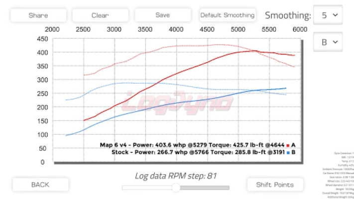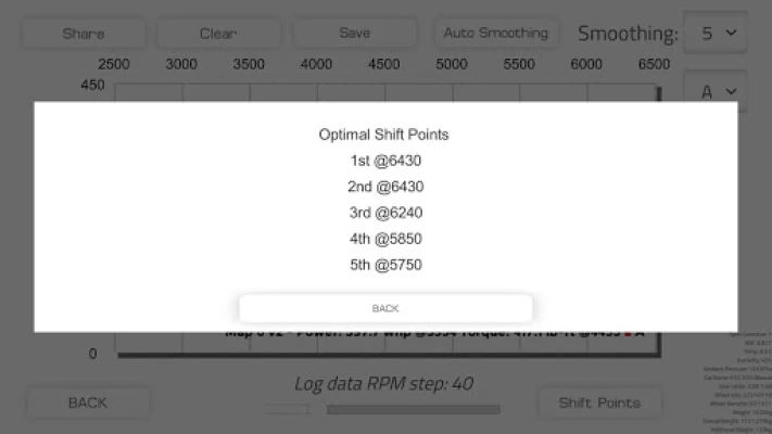 From the torque curve, the app is also able to determine the optimal gear shift points to ensure maximum acceleration. This makes sure you know when to shift, so you always have the most possible power at the wheels.