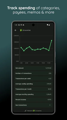 Spend Trackers: Track spending by category (or category group), payee, memo keyword, flag color, or even a combination of these. See net spend, weekly spending, monthly spending, percentage of income spent, and more!