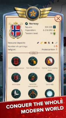 Choose military and economic laws to develop your country. Select the best religion to unite your population: Christianity, Islam, Hinduism, Judaism, Shintoism and more. Pick the right ideology to move your country forward: Capitalism, nationalism, conservatism, liberalism and more.