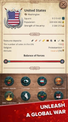 Lead world diplomacy, sign non-aggression pacts, trade agreements, build embassies. Participate in UN votings, introduce draft resolutions: prohibition of wars, weapon sales embargo, invasion resolutions, and much more! Find your allies and compete against armies in turn-based battles.