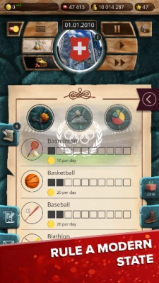 Manage various ministries to make life of your citizens better and safer: police, security service, Ministry of Health, Education, Defense, Infrastructure, Sport, Culture, environment, housing and utilities infrastructure and so much more! You control all the aspect of your countryβs life