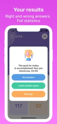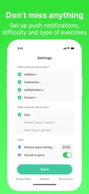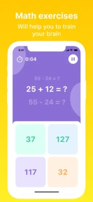 Features for you: - Easy games with operations: addition, subtraction, multiplication and division; - 3 difficulty levels; - Reminder about training: you can set a special time, we'll send push-notifications, so you'll not forget about daily training your brain; - A lot of sounds in game , which will only stimulate you positive way; - Introduction questions will let us understand your needs and make your trainings more personalized.