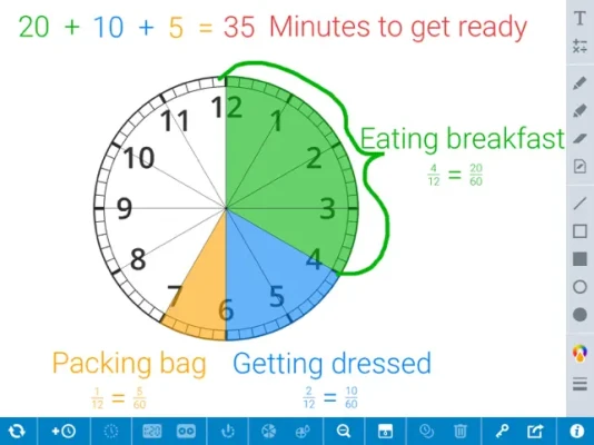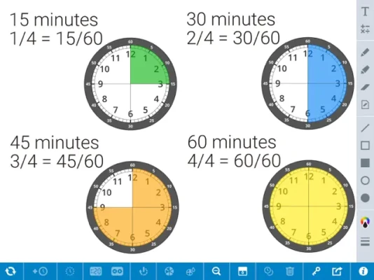 • Overlay and shade circle fractions to explore fractional parts of an hour and fractions with denominators of 2, 3, 4, 5, 6, 10, 12, 15, 20, 30, and 60.