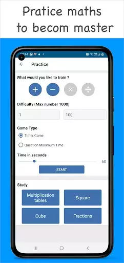 Practice Math Learn additions, subtraction, multiplication tables, division and squares easily.