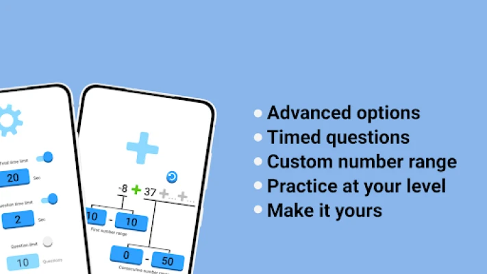 Matix supports advance options where you can set mixed operators, decimal arithmetic questions, several bracket questions and custom time and questions limits, all coupled with custom number ranges, you can get ready for your speed math race tournament and other demanding arithmetic challenges. And this is all backed with an improvement system, so you practice the questions more you struggle with.