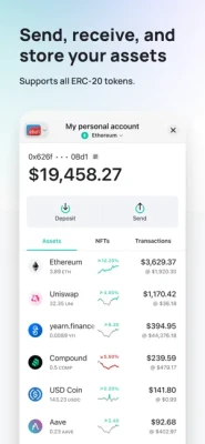 - Hold, send, and receive all Ethereum tokens and stablecoins.