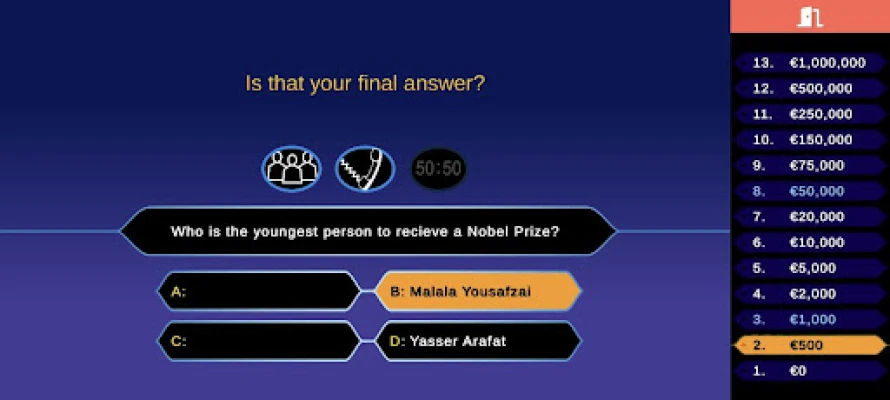 Test if general knowledge is worth a million. Develop your general culture by playing the millionaire game.