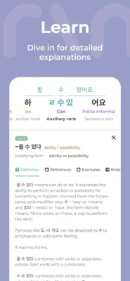 Mirinae has a built-in dictionary & searchable grammar reference and can also be used as a deep, interactive Korean reference that is driven by examples of the things you want to search for. The library has a large and growing number of idiom patterns and neologisms (newly-coined words), essential for understanding modern spoken Korean, Kpop lyrics and Kdrama dialog.