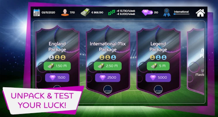 Become the Best! Make the right decisions for their careers by sending your players who have not had the chance to form to the right clubs. Experience the excitement of discovering new players by opening packages. Achieve success with the new players you discover and progress towards becoming the number one manager of the football world.