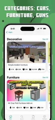 Expand the capabilities of your favorite Minecraft PE with a huge collection of addons. It has furniture mods, adding interior items, cars mods, allowing you to race on a race track with your favorite transport, and much more. Get new items such as furniture, guns, cars, transport, lucky blocks, and TNT that will allow you to create unique gameplay and turn your game into a field for creativity. You can even add a backpack.