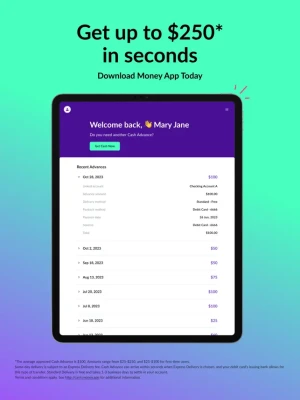 Money App’s Cash Advance service has a 0% Annual Percentage Rate. Your available Cash Advance limit will be displayed to you in your Money App account and may change from time to time. Your limit will be based on your direct deposits, account transaction history, and other factors as determined by Money App. This service has no mandatory fees. Regular delivery is free and takes 1-3 business days to settle in your account. You may pay an optional Expedited Delivery Fee for expedited funds delivery. For a $40 Cash Advance with an Expedited Delivery Fee of $4.99, your repayment amount will be $44.99. Generally, your scheduled repayment date will be your next direct deposit date. A Money App Cash Advance is a non-recourse product; you will not be eligible to request a new advance until your outstanding balance is paid. See the Cash Advance Agreement for additional terms, conditions, and eligibility requirements.
