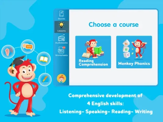 Monkey Stories is most suitable for children aged 2-10 which helps children develop the four skills of listening, speaking, reading and writing.