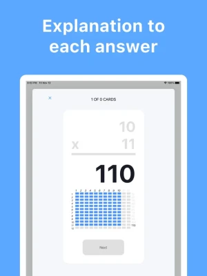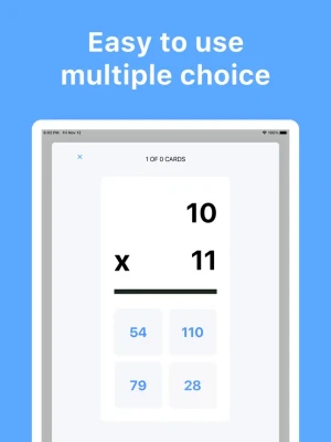 This free app features random questions with factors that go from 1 to 12. Its simple design has multiple-choice answers. Each problem has a variation (like 9 x 3 and 3 x 9), so you can practice both kinds! When you get a problem right, the card flips over and gives you a visual explanation. If you get a problem wrong, it lets you know and you can try again.