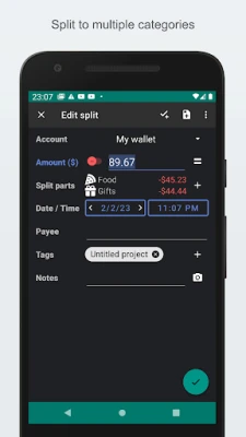- Split transaction: A single transaction can be split into multiple parts (categories and transfers)