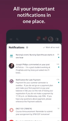 - Receive key notifications from Financial Aid, the Registrar, and the Business Office.