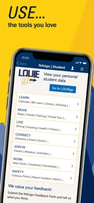 NAUgo is Lumberjacks’ one-stop mobile app for staying informed, connected and up-to-date. Choose your experience:Flagstaff Campus or Statewide Students: Students can log in to see course schedule, grades, advisors and more while enjoying their favorite map, dining, transit and event modules - plus a whole lot more!Guest: The same classic NAUgo that you've grown to love.