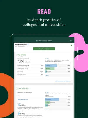 • In-depth college profiles: Explore nearly 7,000 college profiles that include data on cost and financial aid, admissions requirements, student life and more. You can also read reviews from current students and alumni.