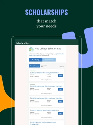 • Scholarship search: Browse and apply for college scholarships by category or get matched directly with scholarships you are eligible for.