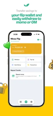 Nkwa flip: a virtual wallet in our app that lets you withdraw your saved funds (into a mobile money wallet) or transfer them.