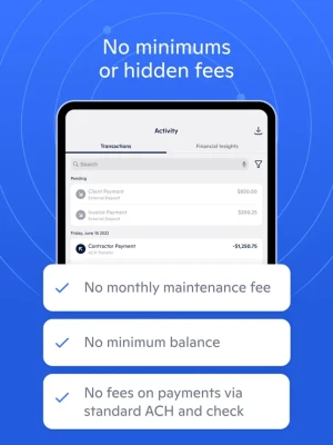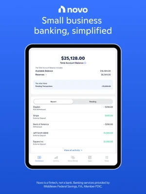Novo is a fintech, not a bank. Banking services provided by Middlesex Federal Savings, F.A.; Member FDIC. Novo provides free banking tools to small businesses, all within the Novo app. You can link your existing accounts, control your debit card, pay your bills, process ACH transfers, deposit checks, categorize transactions, and separate your funds for savings in Reserves.
