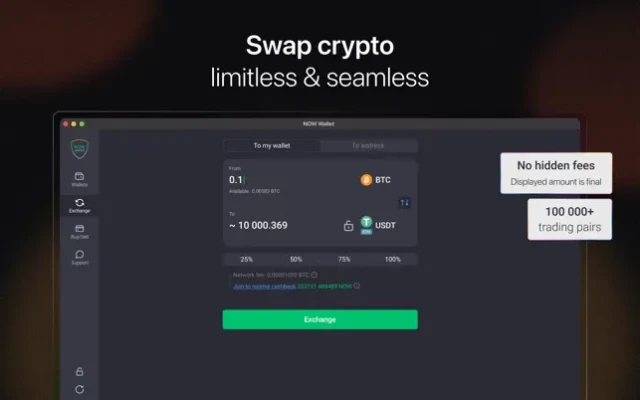 Both crypto-to-crypto and fiat-to-crypto exchanges are available right in the wallet. Whether you are making your first steps in crypto or want to diversify your portfolio, you can use your bank account or Visa/MasterCard with the best possible fiat-to-crypto rates. NOW Wallet allows you to exchange more than 450+ cryptos in a few clicks right in the app.