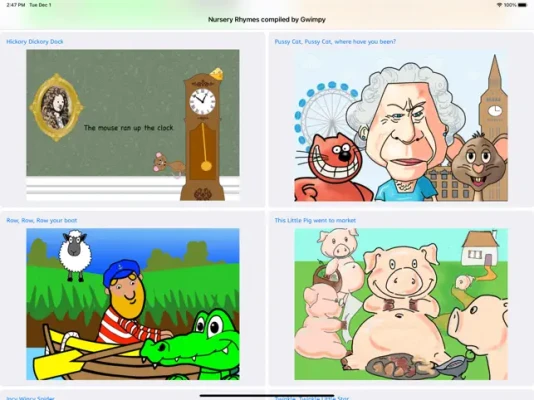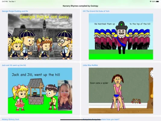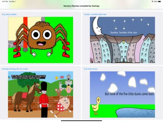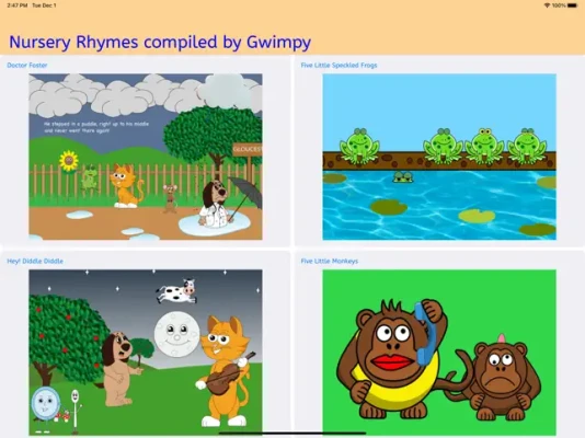 Our ever-growing library includes rhymes like "Five Little Monkeys" and "The Grand Old Duke of York," with more added regularly. Watch for updates and watch your child blossom with Gwimpy Nursery Rhymes!