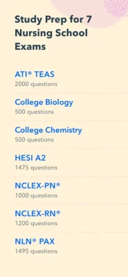 Nursing School Pocket Prep gives you access to study prep for 7 different nursing school exams all in one place, with 500-2000 practice questions for each exam.