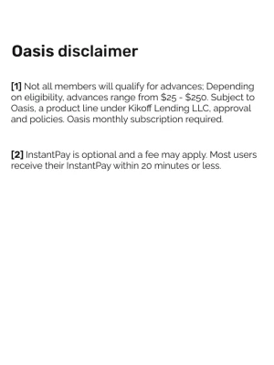 *Not everyone will qualify for a Cash Advance offer. Offer amounts range from $25 - $250 and are based on Oasis’s eligibility requirements. Instant delivery is optional, and fees may apply. See Oasis’s Terms for instant delivery fee amounts.