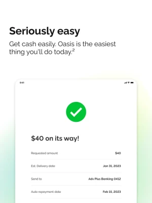 Oasis will meet you where you are. Struggling to make it to payday? Cash Advance from $25 to $250 instantly* to the rescue. No hard credit pulls, no money down, no minimum credit score to qualify. Stop stressing about money and start living.