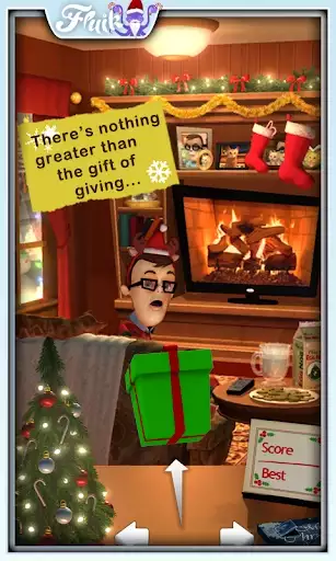 Complete challenges to unlock new items. Play the usual swipe-to-score game, or enjoy several mini games such as "Catch the Elf" and "Dance Santa Dance!" Shoot some stocking stuffer hoops, or really drive him crazy with some fancy channel surfing moves.
