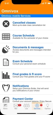 Omnivox Mobile connects to the Omnivox services offered by your University or College, and offers you instant access to many services.