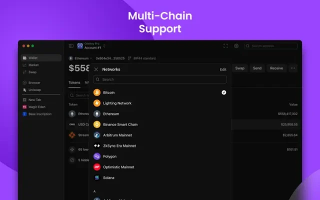 BTC, Lightning Network, Solana, Aptos, Near, STC, DOGE, LTC, Tron, EVM Chains (BSC, ETH, Arbitrum, Avalanche, Optimism, Polygon, CELO, CRO, FTM, HECO, OEC, xDai, and customized EVM Network).