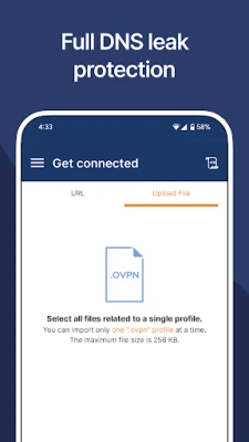 OpenVPN Connect receives configuration information for the VPN server using a “connection profile” file. It can be imported into the app using a file with a .ovpn file extension or a website URL. The file or website URL and user credentials are provided by the VPN service administrator.