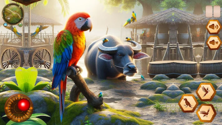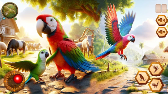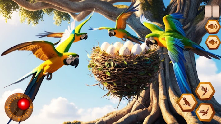 Challenging life of a colorful Talking parrot life simulator in the jungle! In Parrot bird simulator with 3D graphics, you’ll explore nature,singing Birds, build a nest, raise your bird family, and survive thrilling adventures in an open-world environment filled with danger and discovery on Bird Land of talking parrots bird game.