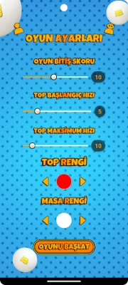 ✅ Özelleştirilebilir Oyun: Maksimum skor, topun başlangıç hızı ve maksimum hızını sen belirle.