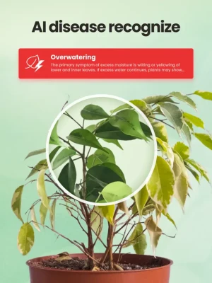 Through our app's features, you'll be able to identify the plant in front of you, determine the ideal watering schedule for your flowers, access proper care plans, and understand the reasons behind dry leaves on your plants.