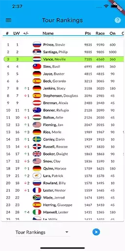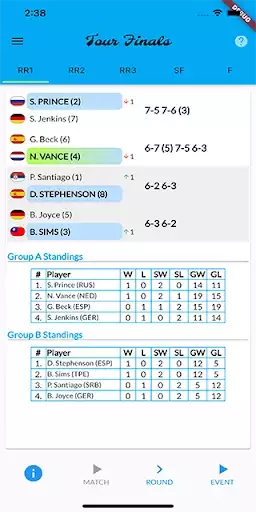 View detailed rankings based loosely on the actual professional tennis tours and follow your favorite players with highlighted results and rankings.
