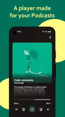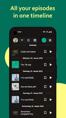 • Sort all episodes of all your followed podcasts in a single timeline • Get notified when new episodes are being released • Filter episodes (E.g. all not yet played episodes of podcast X) • Bookmark the episodes you haven't had time to listen to yet • Specialized podcast player