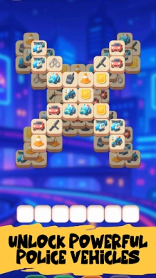 This game combines the satisfaction of merging, the strategy of Mahjong-style puzzles, and the fun theme of police racing and car collection.