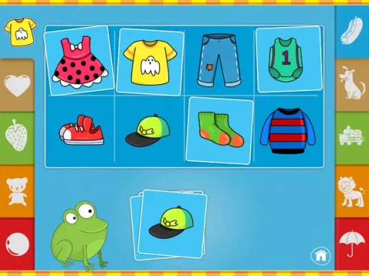 This game is intended for toddlers aged 3+. The game presents 12 boards each focused on developing a set of basic concepts such as size, colors, numbers and patterns using everyday objects from the child's world such as clothes, food and many more.