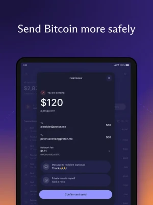 Bitcoin transactions are permanent and there's no bank you can call if you make a mistake. Copying the wrong 26-character Bitcoin address can be catastrophic. Proton Wallet's unique Bitcoin via Email feature means you only need to verify another Proton Wallet user's email instead, reducing the likelihood of errors. Each BTC address is cryptographically signed with PGP by the recipient's app, ensuring that it belongs to the recipient.