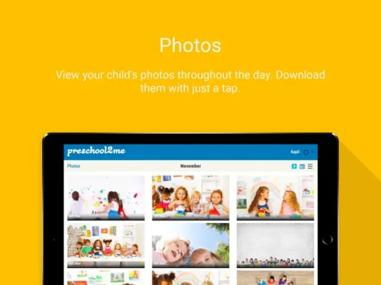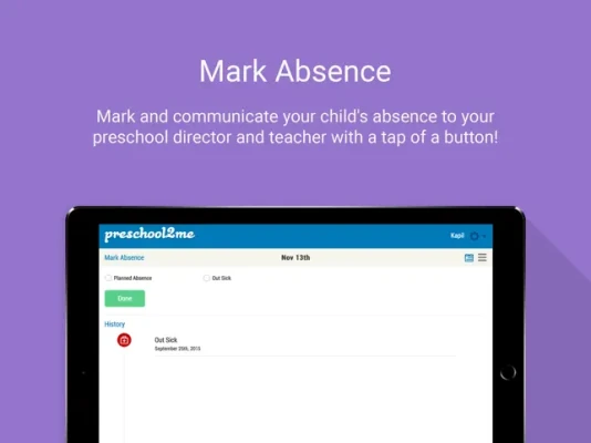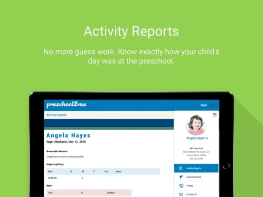 - Beautiful Activity Reports - Announcements - View and Download Photos - Communicate At Drop Off information to teacher - Meal Calendar - Communicate Out Sick and Planned Absence to director and teacher