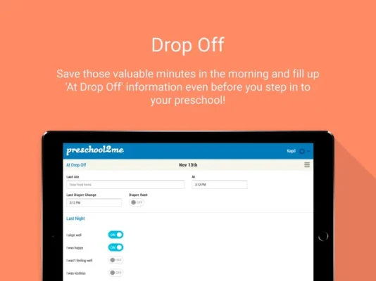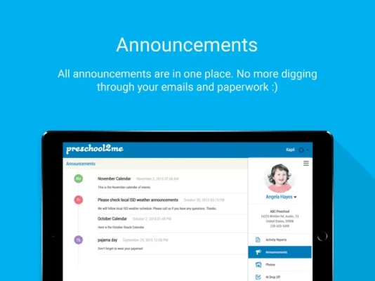 Preschool2me Parent Pro makes it easy for parents to view their child’s pictures, activity reports, announcements sent from the preschool. Parents can even communicate with the preschool by sending At Drop Off and Absence information. No more viewing information just via email. Enjoy the ease of viewing everything you want to know about your child’s day right at your fingertip!
