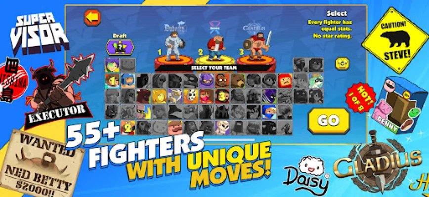 PVP online with your team of 3 fighters against players from around the world or against AI. *ALL PVP Characters have balanced stats, there is no 'pay2win' for this mode.* (PVP 2.0 in the works)