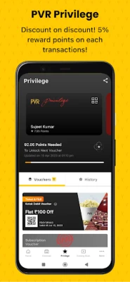 • PVR Privilege –. Get set to be rewarded on every transaction you make at PVR Cinemas or on our website. You earn 5 PVR Privilege Points for every INR 100 you spend on tickets & food & beverage items. Free Large Popcorn (Salted) on your first transaction post enrolment. The goodness doesn't end here; after earning 50 points, you automatically receive a voucher for the amount. Your vouchers are valid on subsequent transactions at our cinemas, as well as on our website and mobile app. That's not all! With PVR Privilege membership, you get birthday bonuses, invites to exclusive events & premieres, and more, to make your movie-going experience hugely rewarding.
