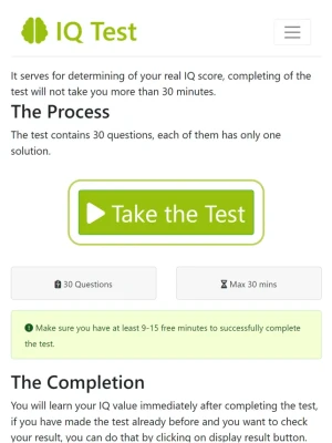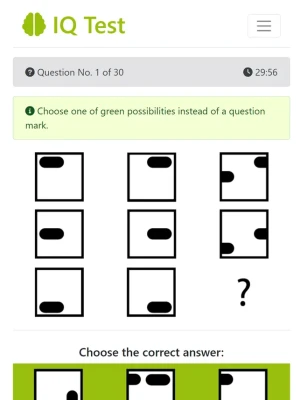 - This IQ test is very accurate. - The test contains 30 very important questions. - The resolution time limit is 30 minutes. - Finding out the test result is fast. - The result can only be found at the end of the test. - The test questions are very balanced and well chosen.