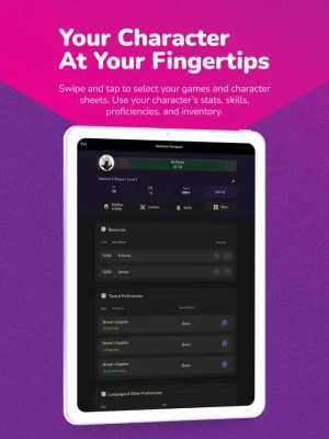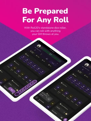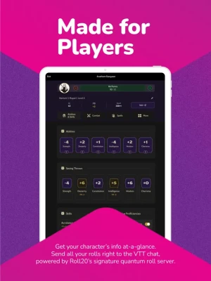 View your character’s stats and skills during your game session, including your spell DC and proficiencies. Track inspiration, spell slots, hit points, ki points, and sorcery points. Ready to roll for initiative or make an ability check? Let us do the math for you. Dice rolls made in the app are also sent to the Roll20 VTT chat, powered by our signature quantum roll server.