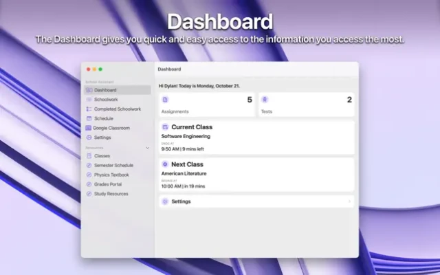 - See your current class and next class on the Dashboard and with Home Screen / Desktop Widgets
