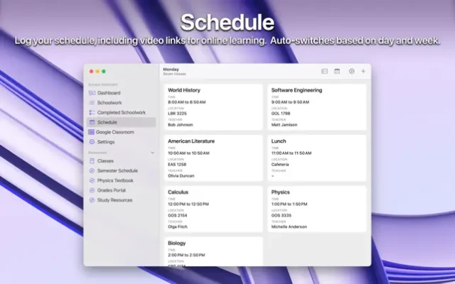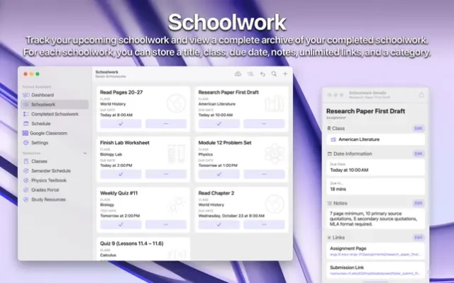 School Assistant by Sun Apps is a simple but powerful school planner app. It allows you to quickly and easily keep track of homework, tests, and your schedule, see and save Google Classroom assignments, quickly access saved websites, and more.