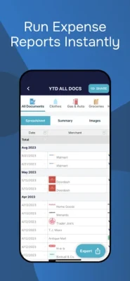 • Turn your receipts into PDFs and organized spreadsheets categorized by expenses with just one tap.